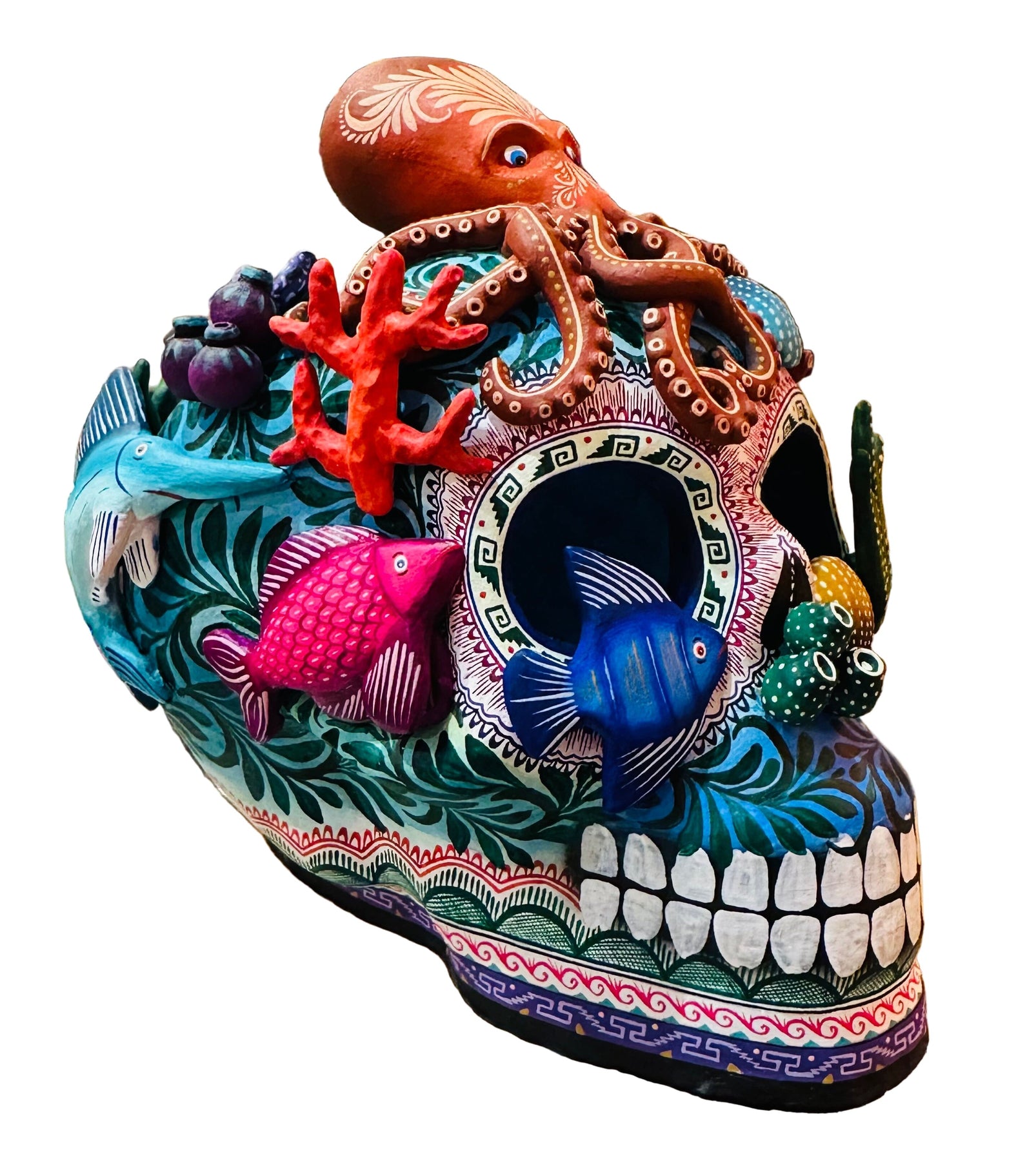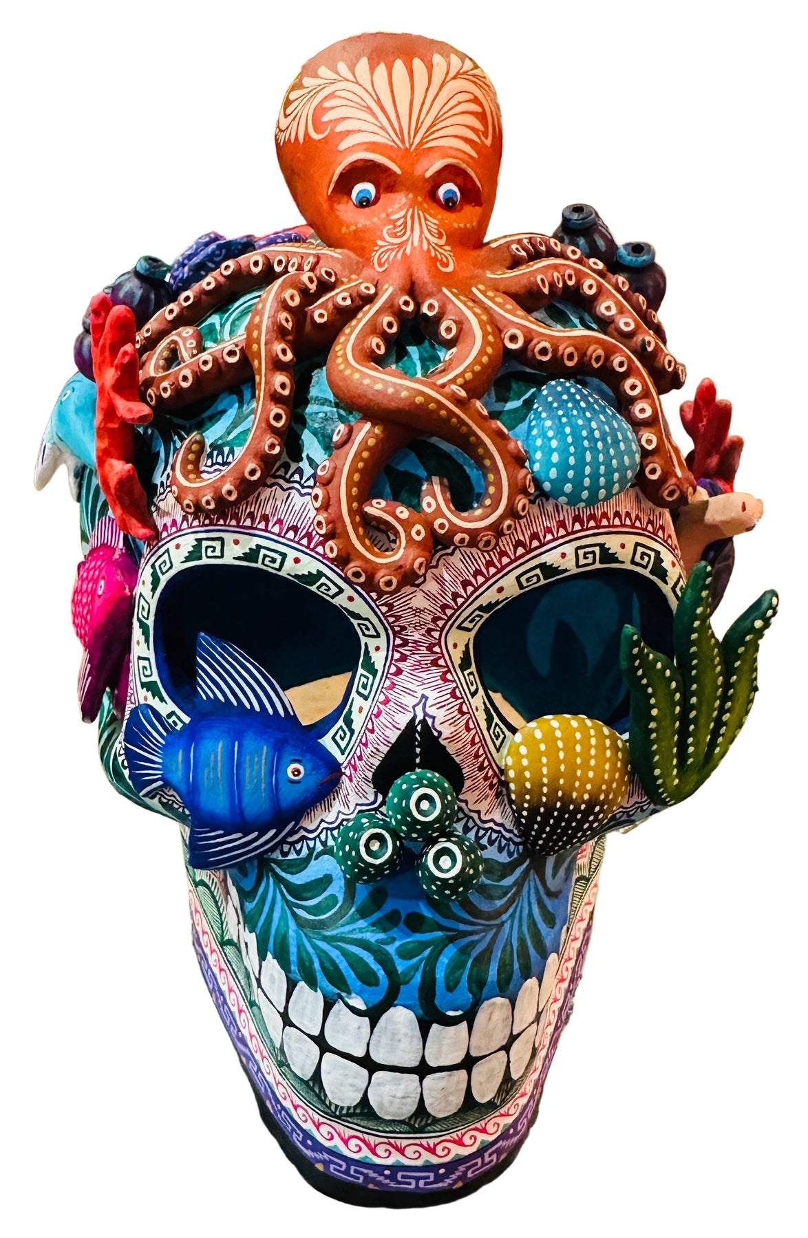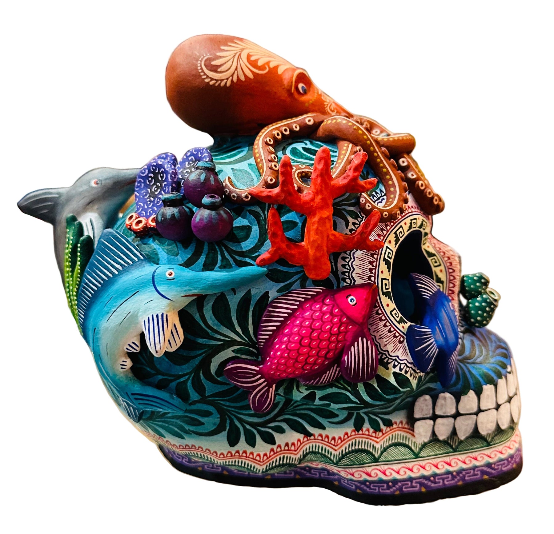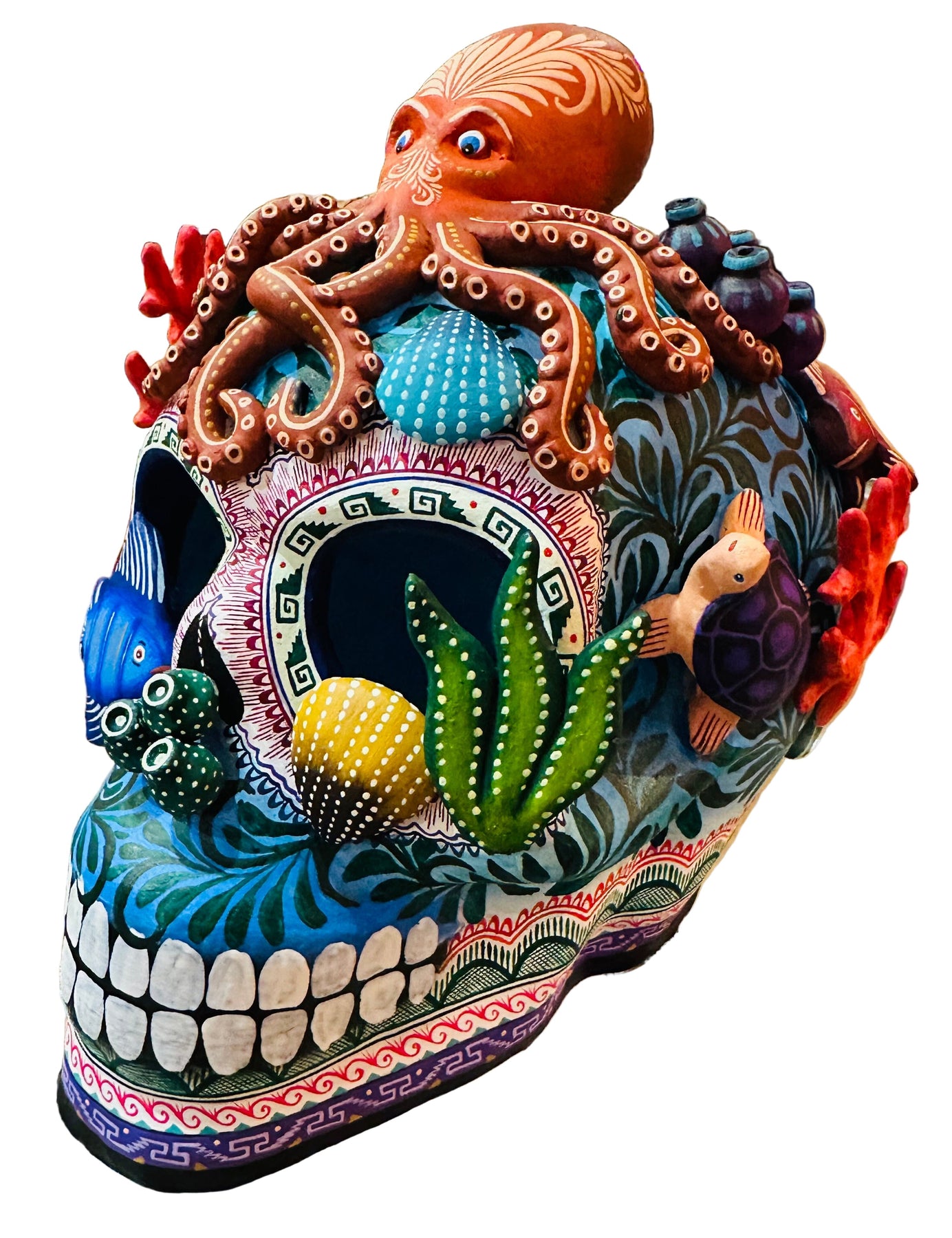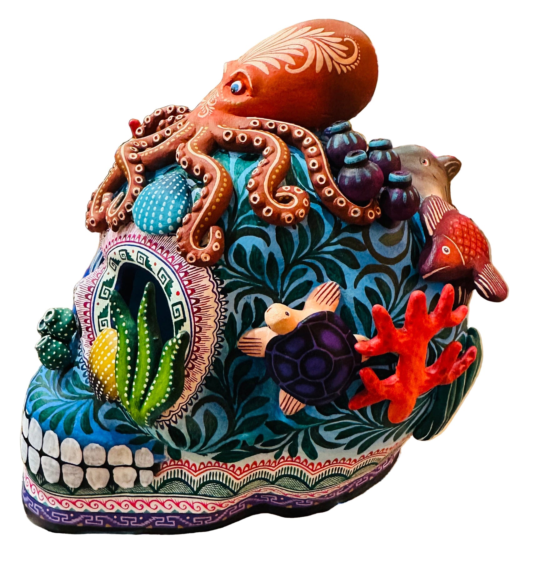 Stunning hand built ceramic skull representing beautiful sea life.
