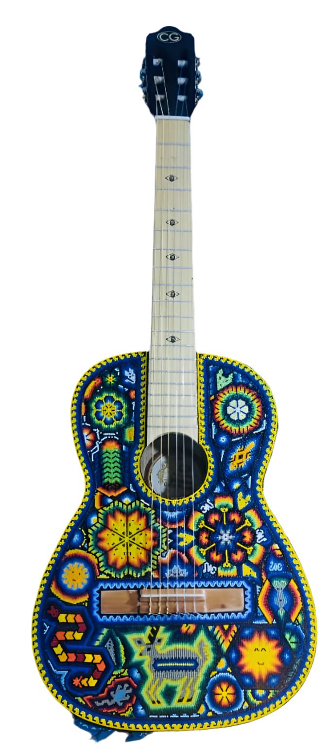 The Huichol Indians are a proud indigenous people found in the Sierra Madre regions of Nayarit and Jalisco. They have no written language and communicate with the spirit world through symbols and rituals. The yarn paintings and beadwork imagery reflect the Huichol culture and their sacred traditions and beliefs. The sale of their yarn paintings and beadwork enables them to maintain their way of life.