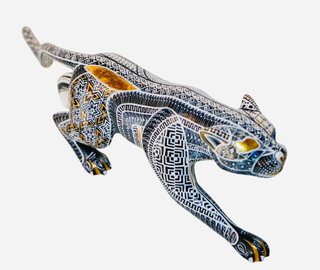 This piece is very intricately carved out of a single piece of copal wood and painted in zapotec design using acrylic paint. It is also finished with lacquer to give it shine.