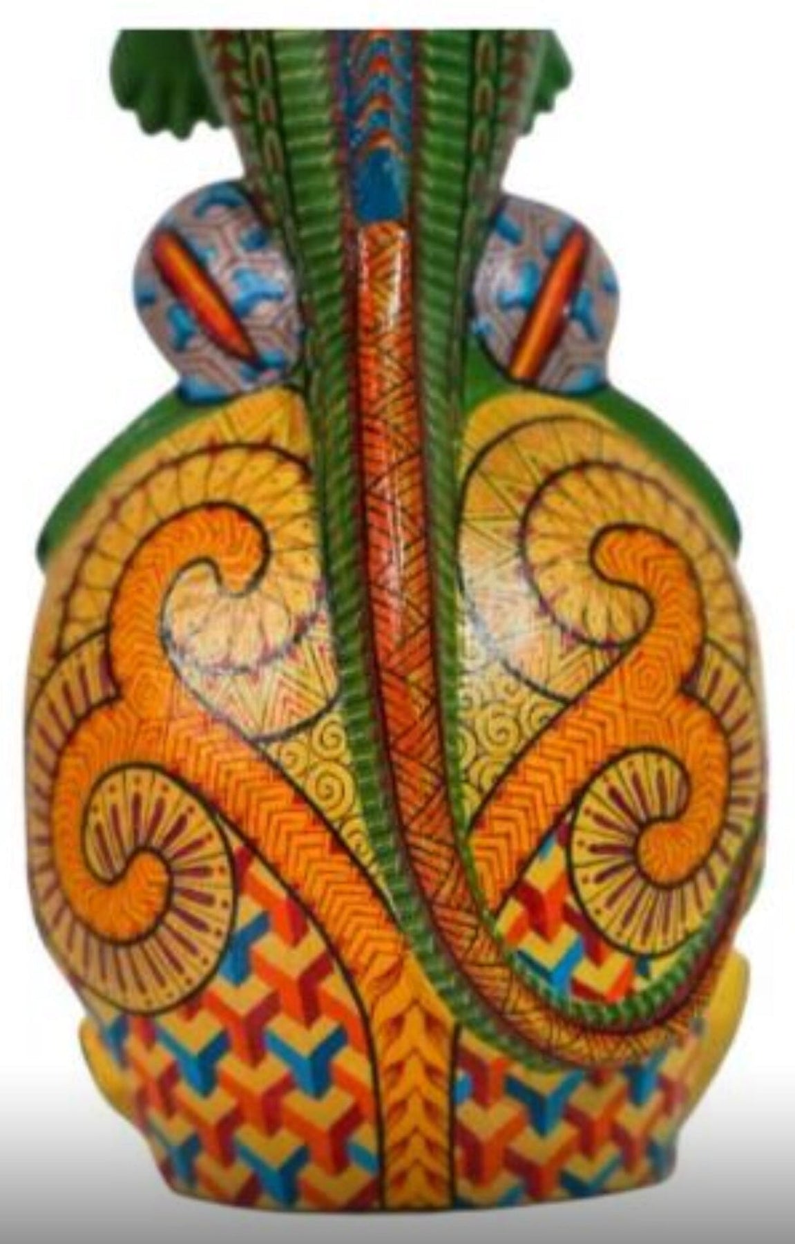 This piece is very intricately carved out of a single piece of copal wood and painted in zapotec design using acrylic paint. It is also finished with lacquer to give it shine.