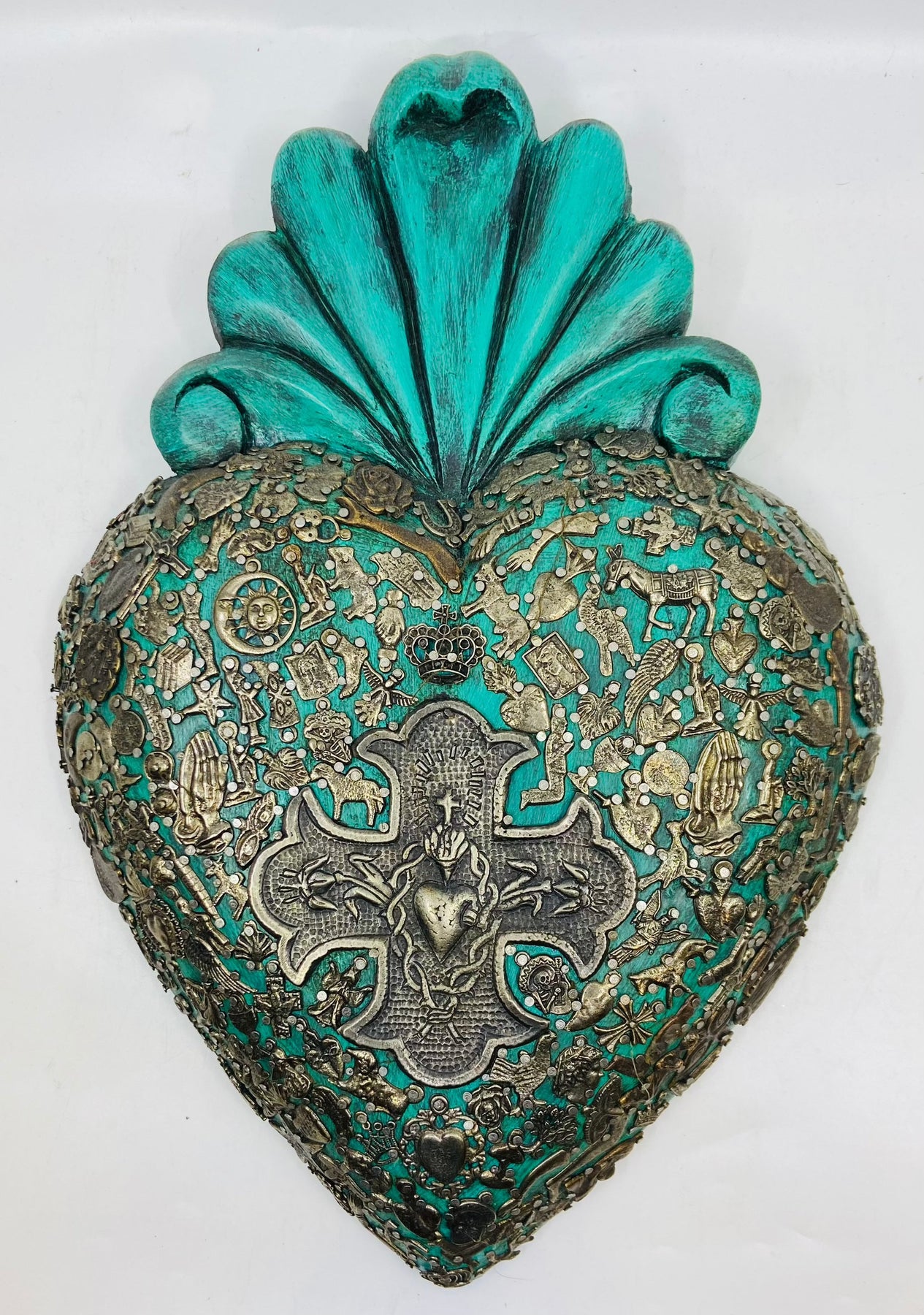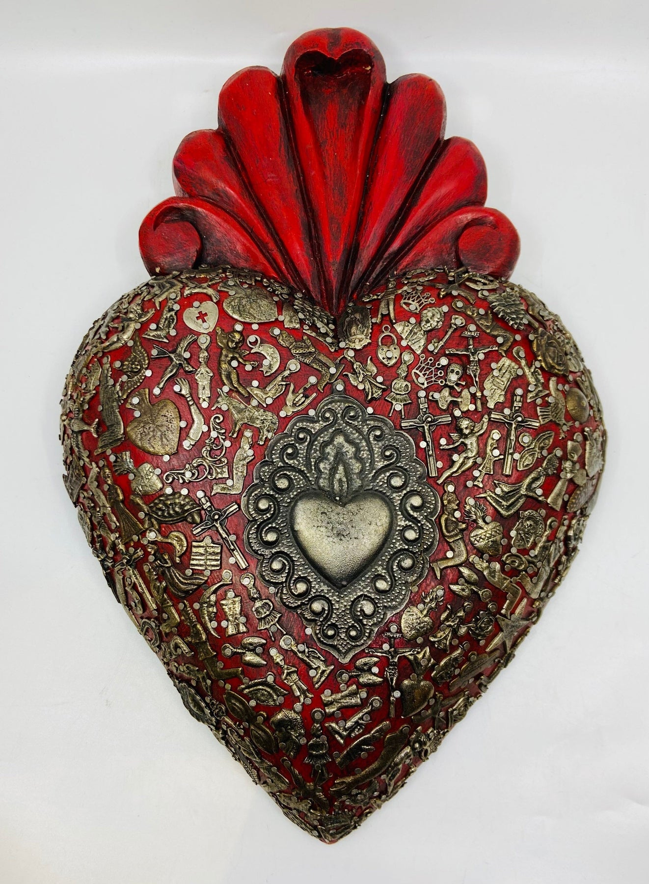 Joaquin Garnica is a talented woodworker and painter from Michoacán Mexico. First he hand shapes his pieces, then sands and lastly he paints an original painting on them. His pieces often depict the Virgin of Guadalupe, sacred hearts and flowers among other images. He is unusual in his use of oil paints instead of acrylics which give his artwork a glow that seems to come from within.
