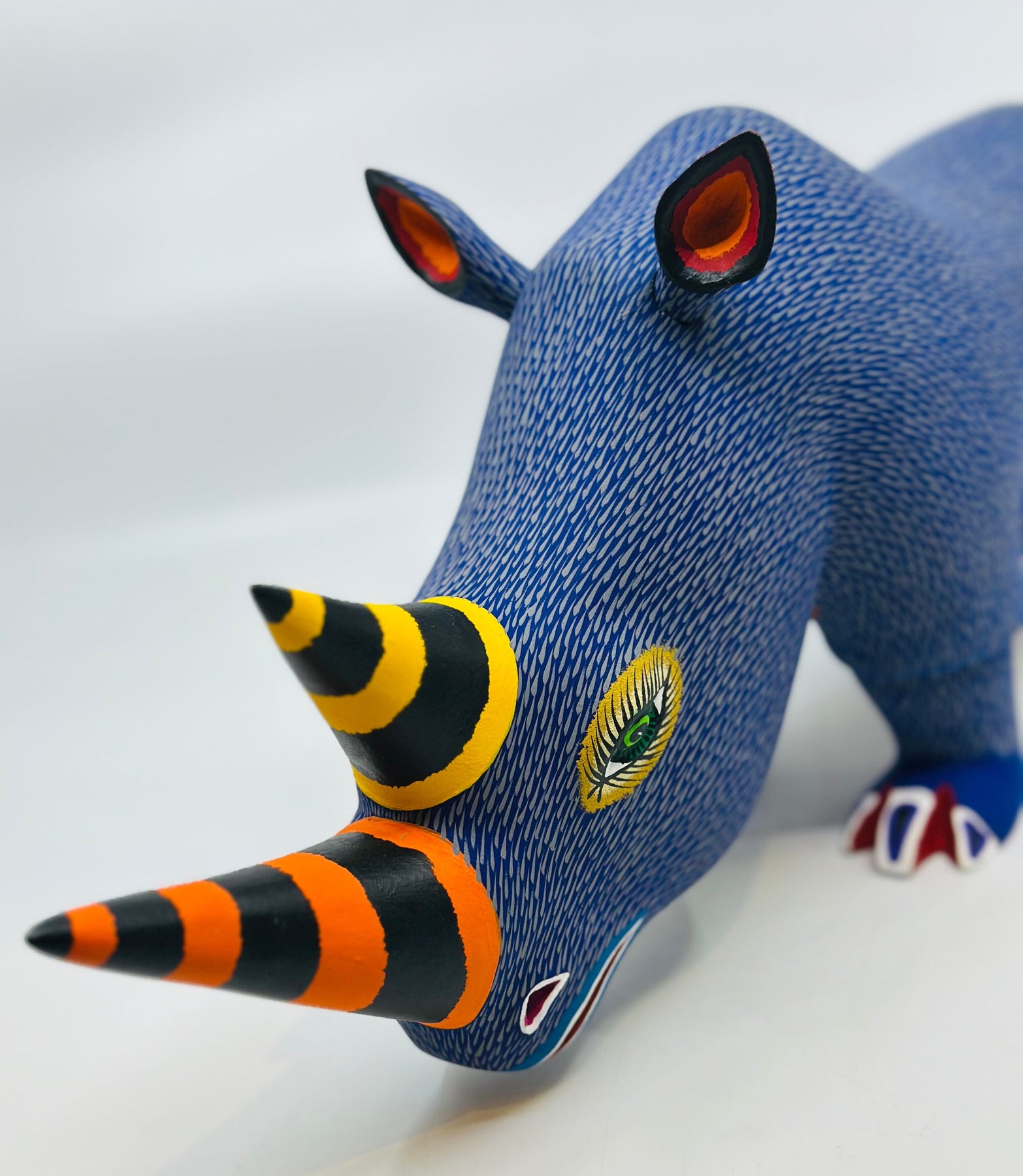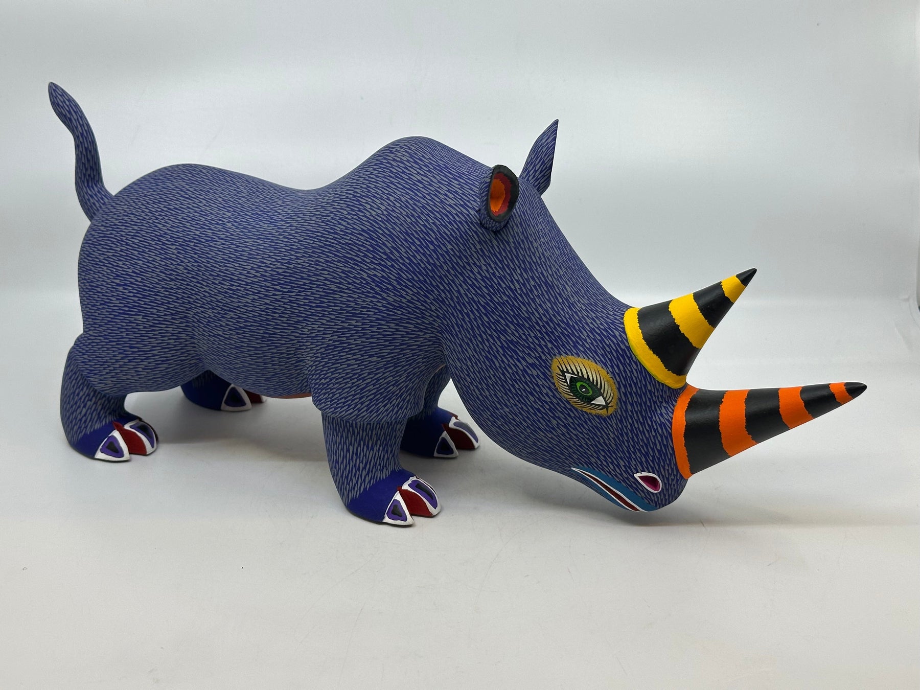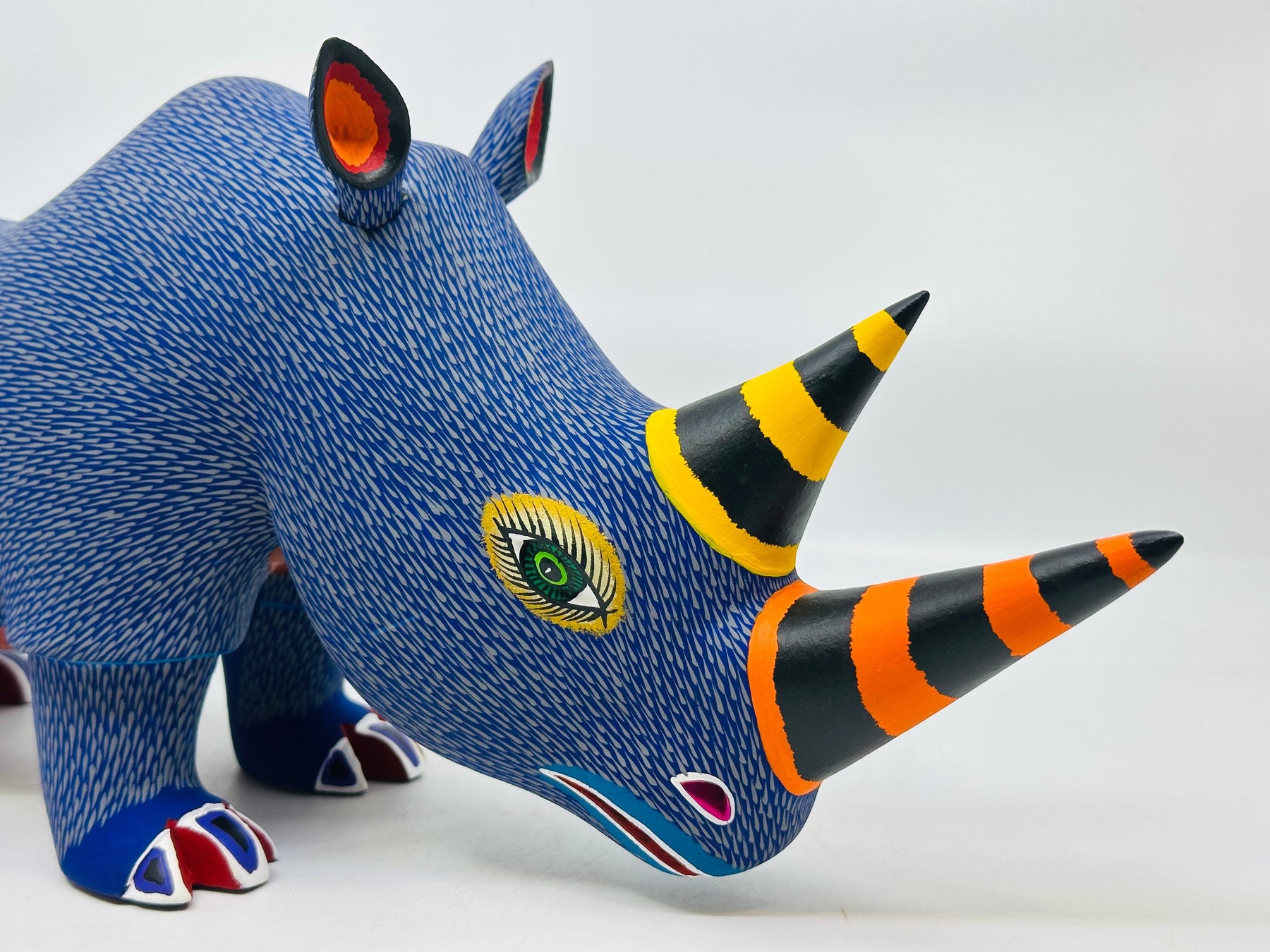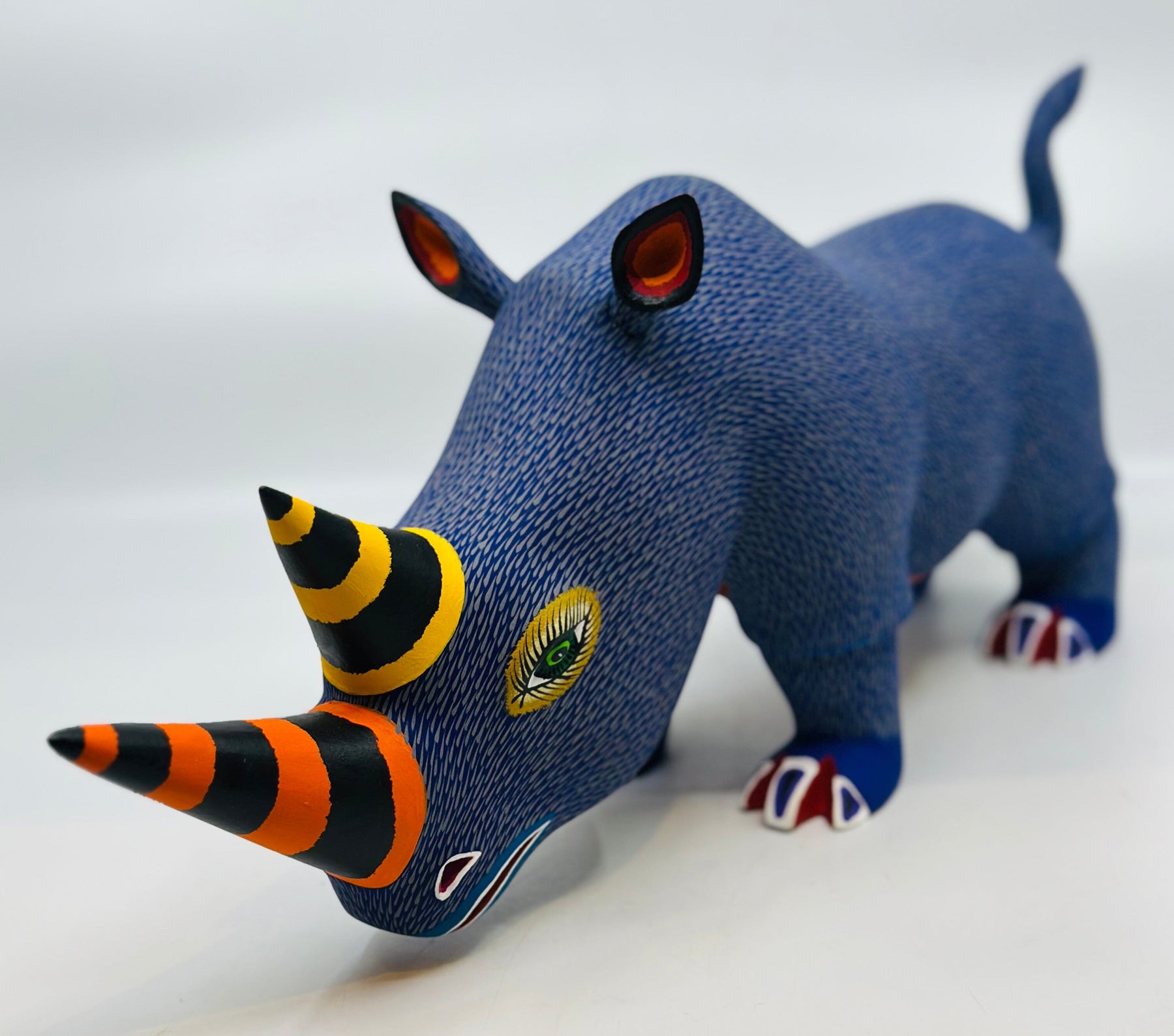 Each figure is handmade from copal wood using machetes and pocket knives. Artists carve the basic shape of a figure in a few days and then spend several days creating the fine detail. They further hand sand each piece and then spend several days in the painting process. The artists use fantasy and imagination in their intricately painted designs. The carvings are full of movement and humor and are an authentic folk art form that knows no boundaries.